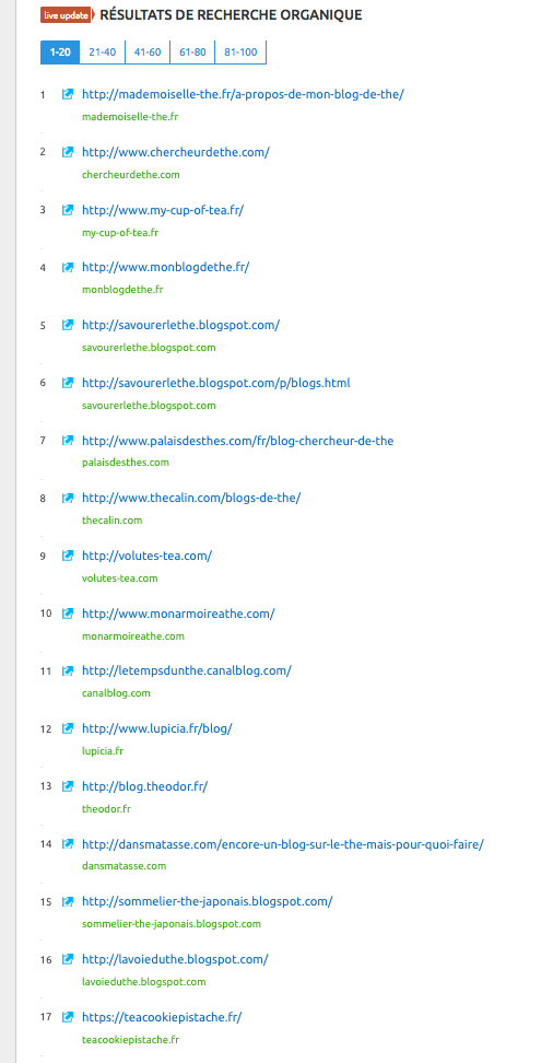 Sinon niveau blog tu pourrais presque rajouter le blog autour du thé, pas beaucoup de visites mais assez prometteur ! 🙂